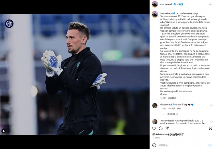 2月5日訊 門將拉杜冬窗離開國米,永久轉會加盟威尼斯。在社交媒體中,拉杜長文告別了國米。