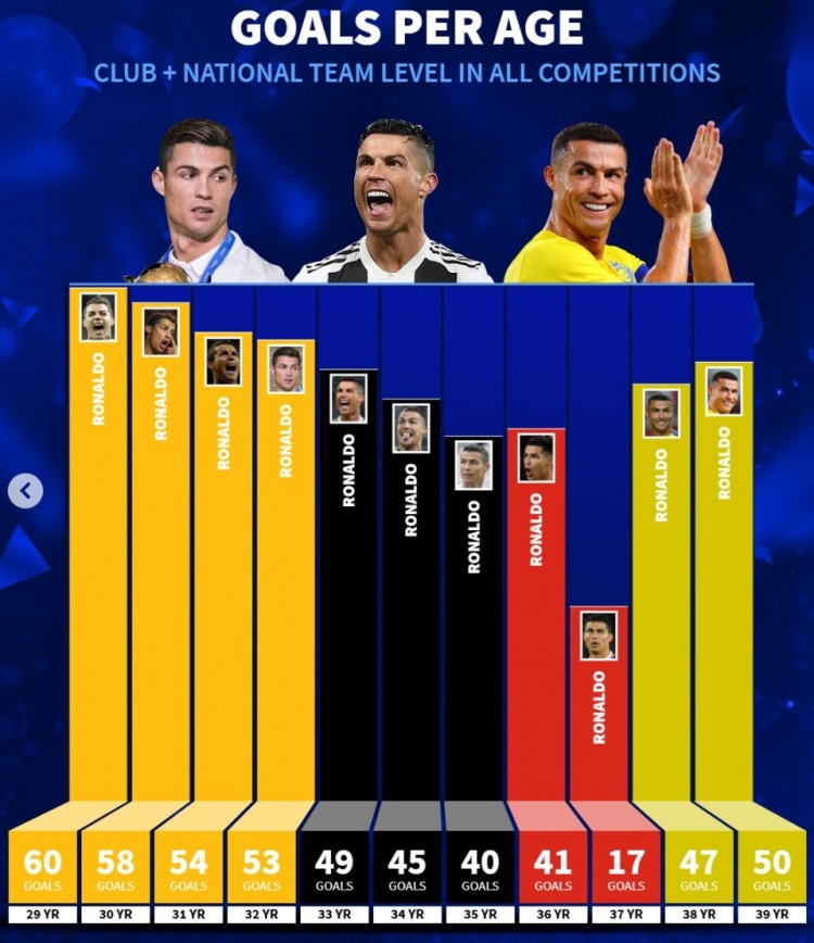 2月5日訊 C羅在今日迎來40歲生日,《轉(zhuǎn)會(huì)市場(chǎng)》也列出了C羅生涯每年的進(jìn)球情況。