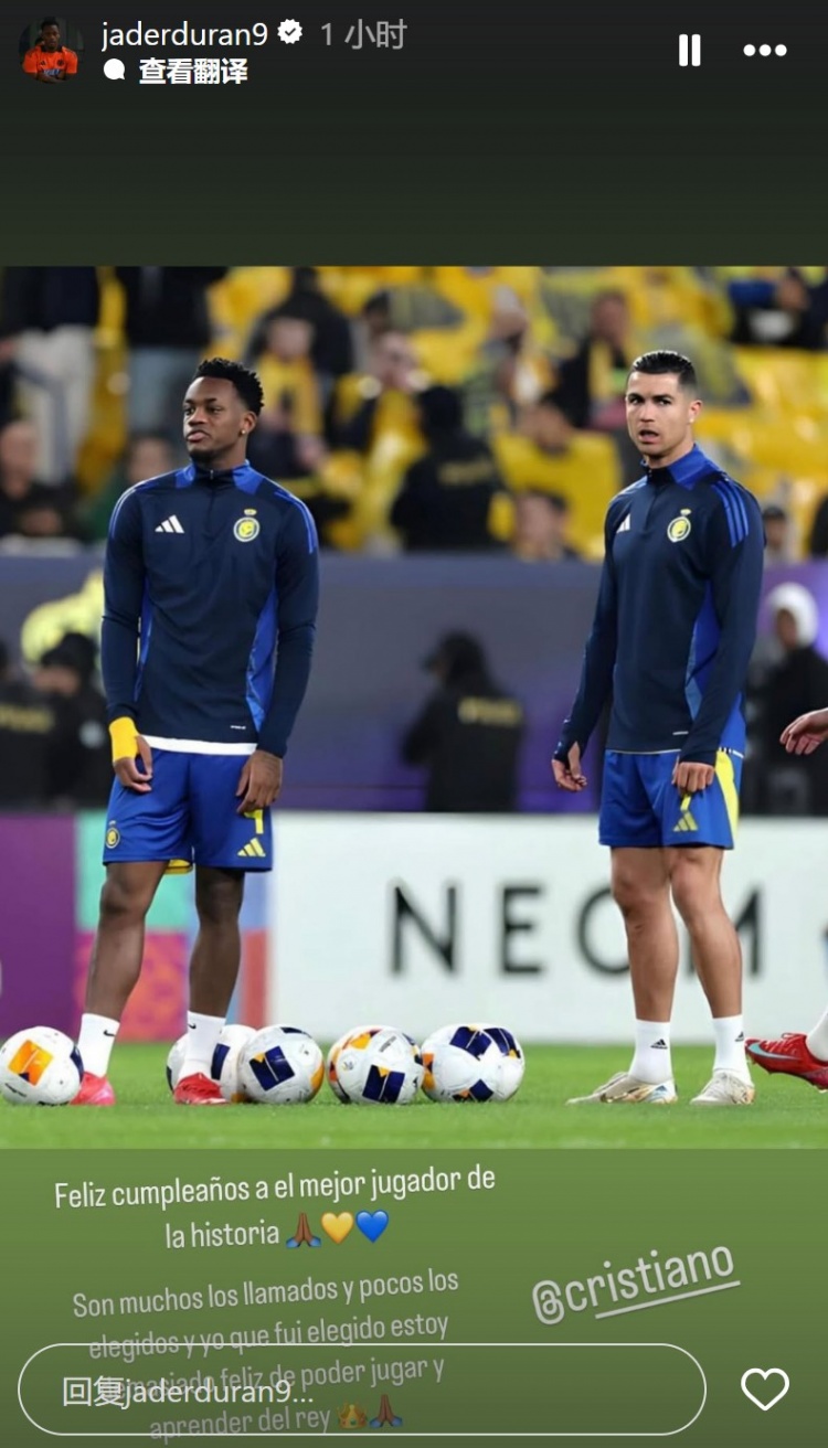 2月5日訊 今天是C羅40歲的生日,剛剛加盟利雅得勝利的哥倫比亞前鋒杜蘭向他送上了生日祝福。