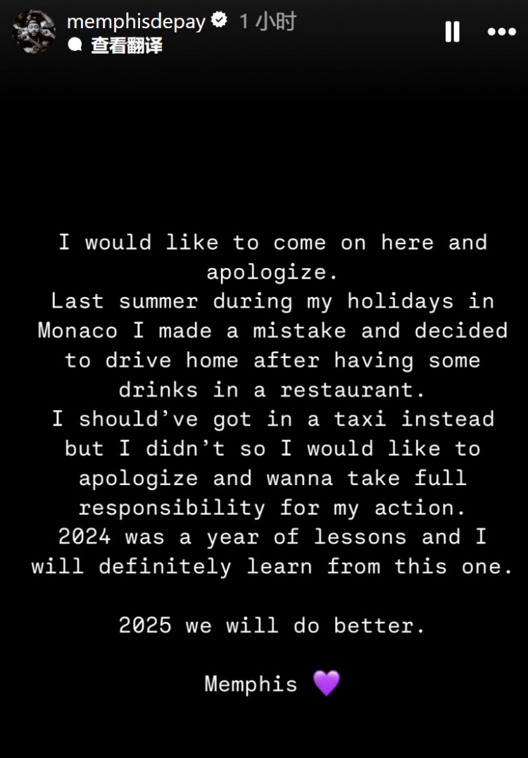 2月6日訊 此前媒體報道稱,30歲的荷蘭前鋒德佩因為酒駕被摩納哥法院判處緩刑。對此,德佩在社交媒體上致歉。