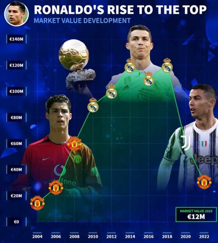 《轉(zhuǎn)會(huì)市場》在2004年才錄入C羅的身價(jià),2004年達(dá)到1800萬歐元,2008年贏得歐冠時(shí)上漲到6000萬歐元。