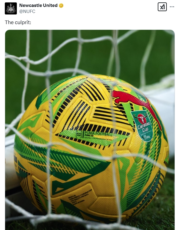 首回合比賽后,阿爾特塔曾吐槽聯(lián)賽杯用球讓球員不適應(yīng)。本場(chǎng)賽后,紐卡社媒曬比賽用球并配文:“罪魁禍?zhǔn)??!?/p>