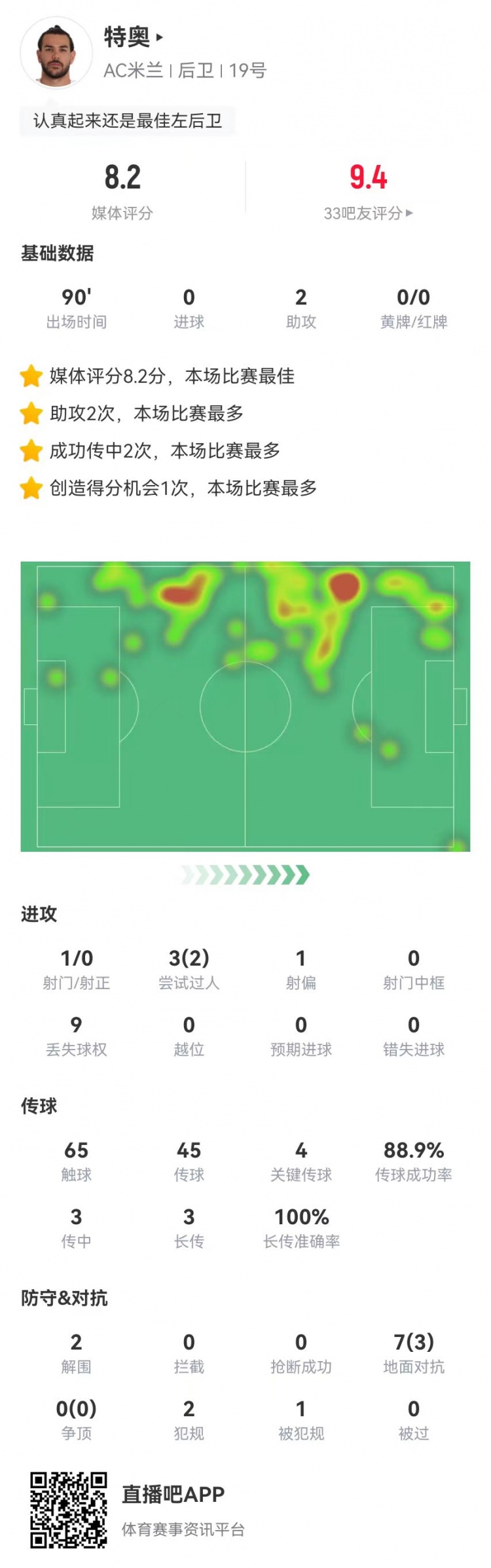 發(fā)布時間:2025年02月06日 06:50點擊:欄目:足球新聞 2月6日訊 米蘭在本輪意大利杯3-1擊敗羅馬,特奧本場數(shù)據(jù)如下:首發(fā)踢滿全場2助攻2解圍1封堵7對抗、3成功9丟失球權(quán)2犯規(guī)1造犯規(guī)65觸球45傳球、40成功,成功率89%4關(guān)鍵傳球3傳中、2成功3長傳、3成功1創(chuàng)造重大機會1射門、0射正3過人、2成功獲評8.2分 除特別注明外,本站所有內(nèi)容均為九球直播整理排版,轉(zhuǎn)載請注明出處:特奧本場2助攻+4關(guān)鍵傳球+1造良機 3長傳3成功 獲評8.2分 本文標(biāo)簽: 足球 AC米蘭 意甲 羅馬