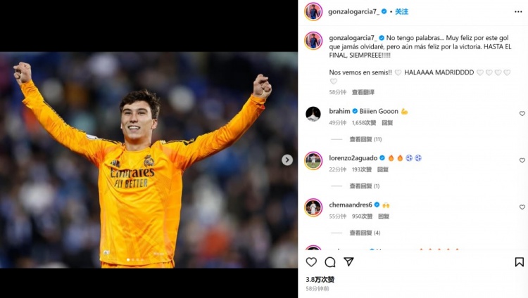 發(fā)布時間:2025年02月06日 08:50點擊:欄目:足球新聞 2月6日訊 皇馬在本輪國王杯3-2絕殺萊加內(nèi)斯,小將貢薩洛-加西亞替補打進絕殺。第90+3分鐘,迪亞斯傳中,小將貢薩洛-加西亞頭球破門打進皇馬一線隊處子球。他也在賽后通過社媒曬出自己的慶祝照,并配文:“我高興到不知道該說什么了……我很高興能夠打進這粒永遠不會忘記的進球,但更高興的是取得勝利。永遠要戰(zhàn)斗到最后一刻!半決賽見!馬德里前進!” 除特別注明外,本站所有內(nèi)容均為九球直播整理排版,轉載請注明出處:絕殺救主!小將加西亞社媒:永不會忘皇馬處子球,高興到不知所措 本文標簽: 足球 西甲 皇家馬德里 萊加內(nèi)斯