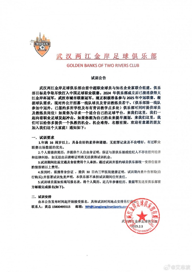 2月6日訊 近日,武漢兩江金岸足球俱樂部官方發(fā)布試訓公告。