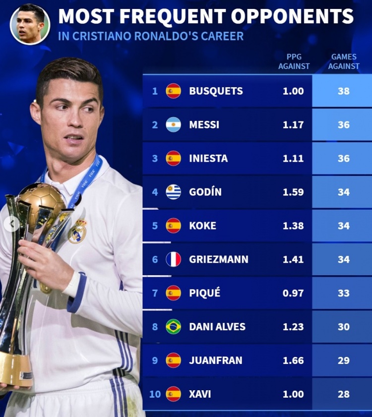 除特別注明外,本站所有內(nèi)容均為九球直播整理排版,轉(zhuǎn)載請(qǐng)注明出處:西甲故人!C羅生涯對(duì)手交鋒榜:布斯克茨38次,梅西&伊涅斯塔36次
