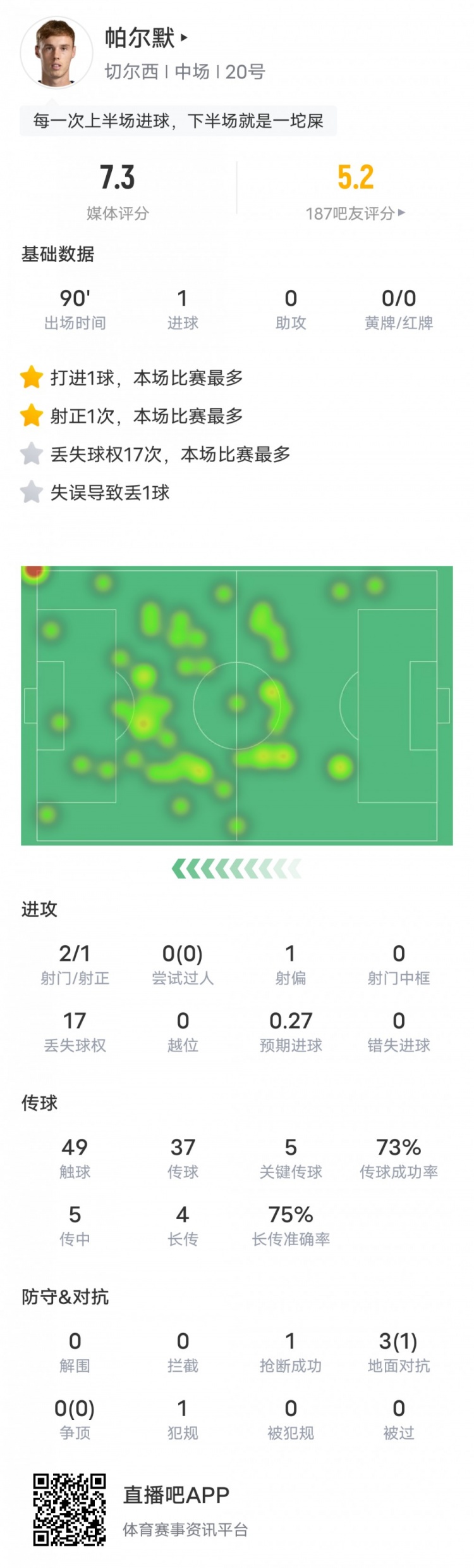 帕爾默本場(chǎng)比賽數(shù)據(jù):