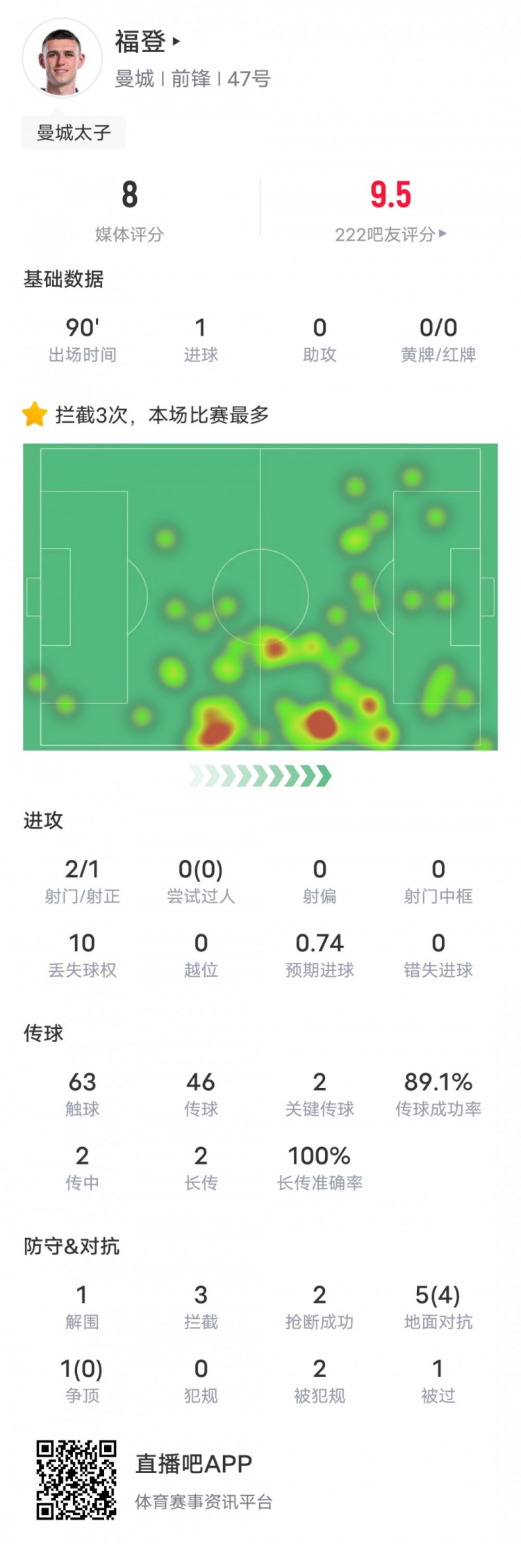福登本場(chǎng)比賽數(shù)據(jù)如下: