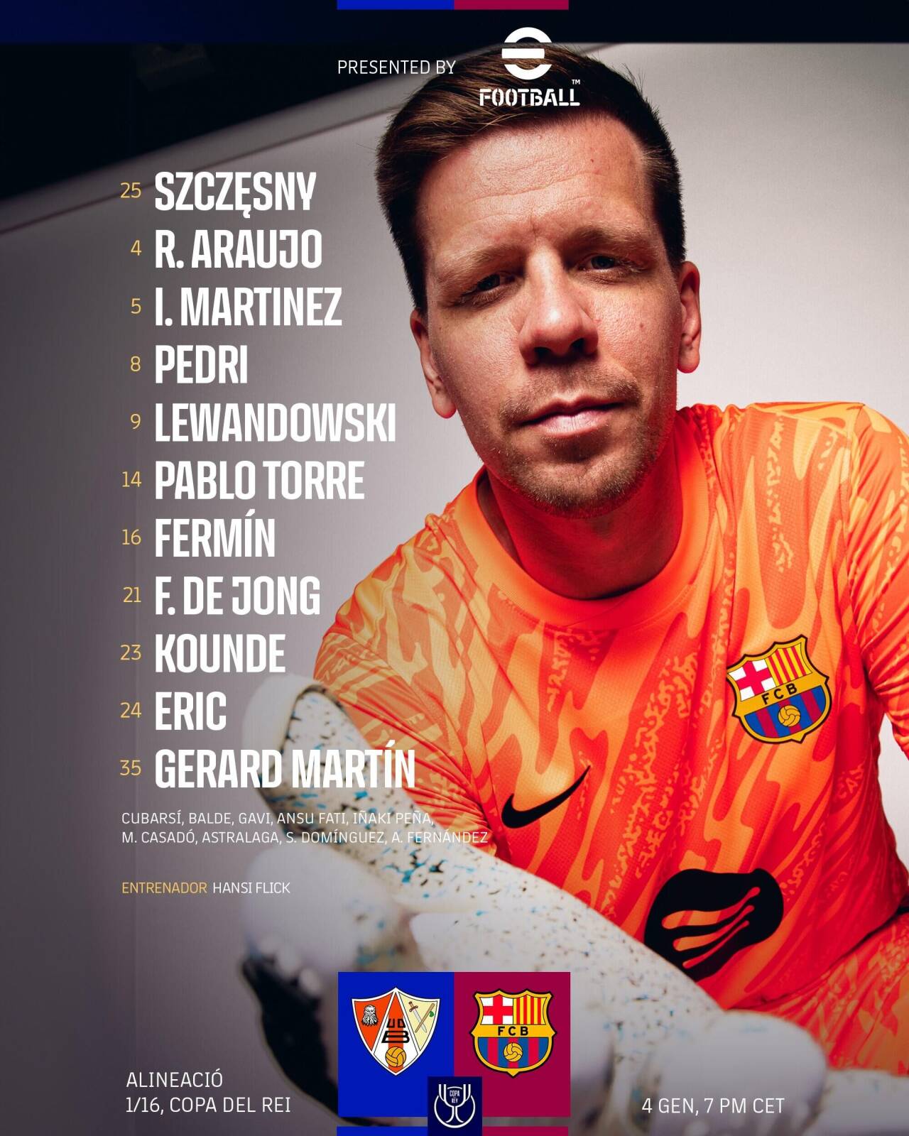 巴薩首發(fā):25-什琴斯尼、23-孔德、4-阿勞霍、5-伊尼戈-馬丁內(nèi)斯、35-杰拉德-馬丁、24-埃里克-加西亞、21-德容、14-巴勃羅-托雷、8-佩德里、16-費(fèi)爾明、9-萊萬(wàn)