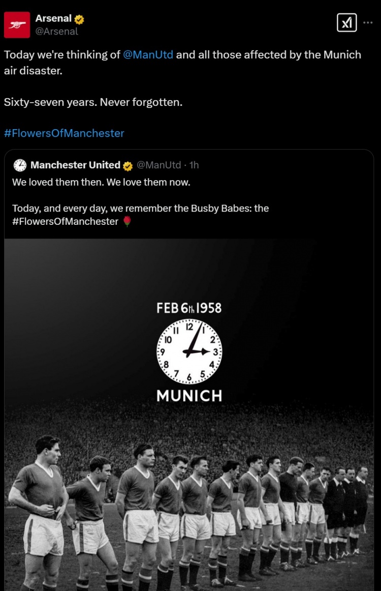阿森納寫道:今天,我們向曼聯(lián)和所有受到慕尼黑空難影響的人們致以哀思。六十七年過去了,我們永遠(yuǎn)不會忘記。