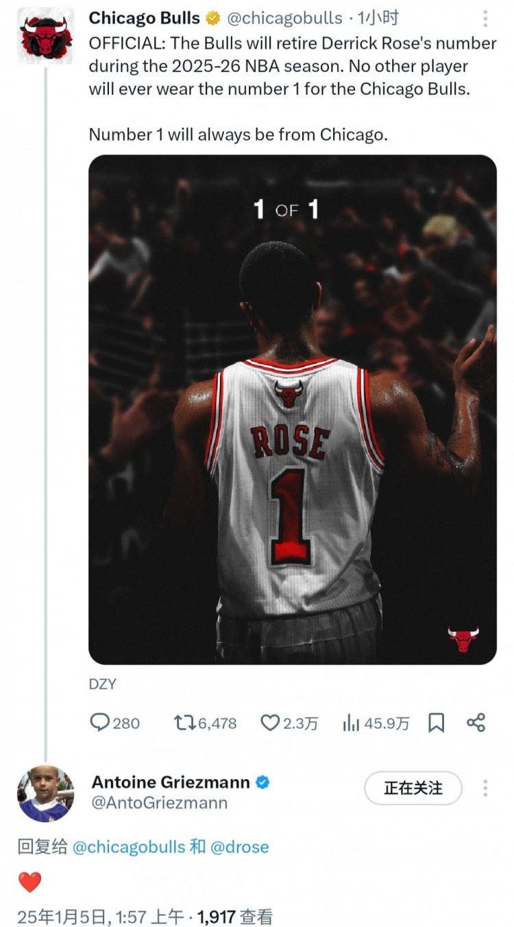 1月5日訊 今日NBA公牛隊(duì)官方宣布,球隊(duì)將在2025-26賽季退役名宿德里克-羅斯的1號(hào)球衣。