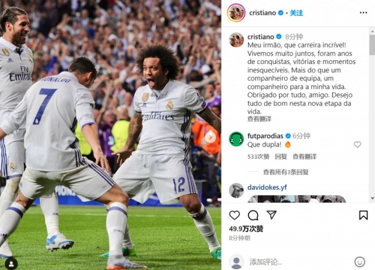 2月6日訊 巴西傳奇后衛(wèi)馬塞洛宣布退役,結(jié)束了自己多姿多彩的職業(yè)生涯。葡萄牙球星C羅曾和馬塞洛在皇馬并肩作戰(zhàn),兩人有著深厚的情誼。在社交媒體上,C羅為馬塞洛送上了祝福。