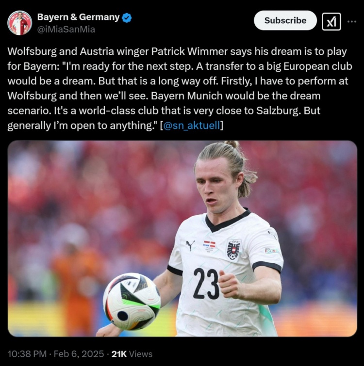 2月6日訊 在接受《薩爾茨堡新聞報(bào)》采訪時(shí),23歲的狼堡邊鋒維默爾表示自己的夢(mèng)想是加盟歐洲大俱樂(lè)部,拜仁是其中的理想選擇。