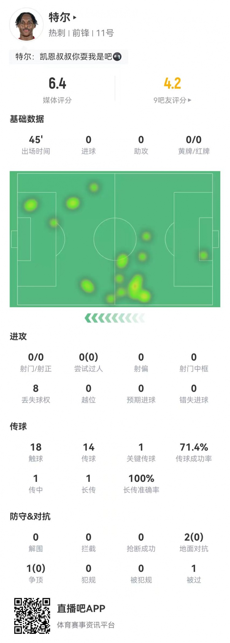 發(fā)布時間:2025年02月07日 06:50點擊:欄目:足球新聞 2月7日訊 熱刺在本輪聯(lián)賽杯0-4不敵利物浦,花費了1000萬歐租借費的新援特爾首秀數(shù)據(jù)如下:替補出場45分鐘0射門18觸球1關(guān)鍵傳球1傳中、0成功1長傳、1成功3對抗、0成功8丟失球權(quán)1被過獲評6.4分 除特別注明外,本站所有內(nèi)容均為九球直播整理排版,轉(zhuǎn)載請注明出處:特爾首秀數(shù)據(jù):替補45分鐘0射門+1關(guān)鍵傳球 3對抗0成功 獲評6.4分 本文標(biāo)簽: 足球 德甲 拜仁慕尼黑 英超 利物浦 熱刺