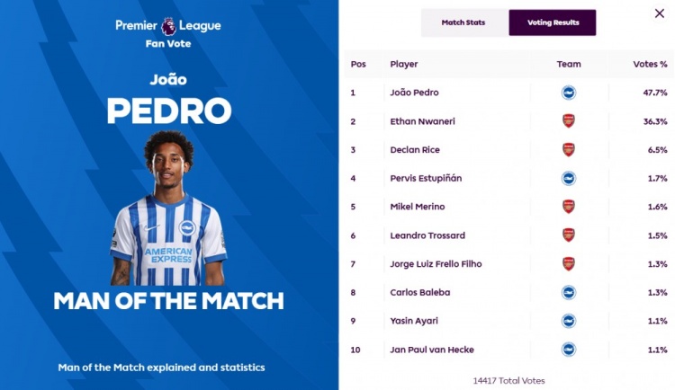 發(fā)布時(shí)間:2025年01月05日 04:50點(diǎn)擊:欄目:足球新聞 1月5日訊 本輪英超比賽,布萊頓1-1阿森納,若昂-佩德羅為布萊頓扳平比分。英超官網(wǎng)宣布,若昂-佩德羅獲得47.7%得票率,當(dāng)選全場(chǎng)最佳球員。 除特別注明外,本站所有內(nèi)容均為九球直播整理排版,轉(zhuǎn)載請(qǐng)注明出處:扳平比分!若昂-佩德羅當(dāng)選布萊頓1-1阿森納全場(chǎng)最佳球員 本文標(biāo)簽: 足球 英超 阿森納 布萊頓