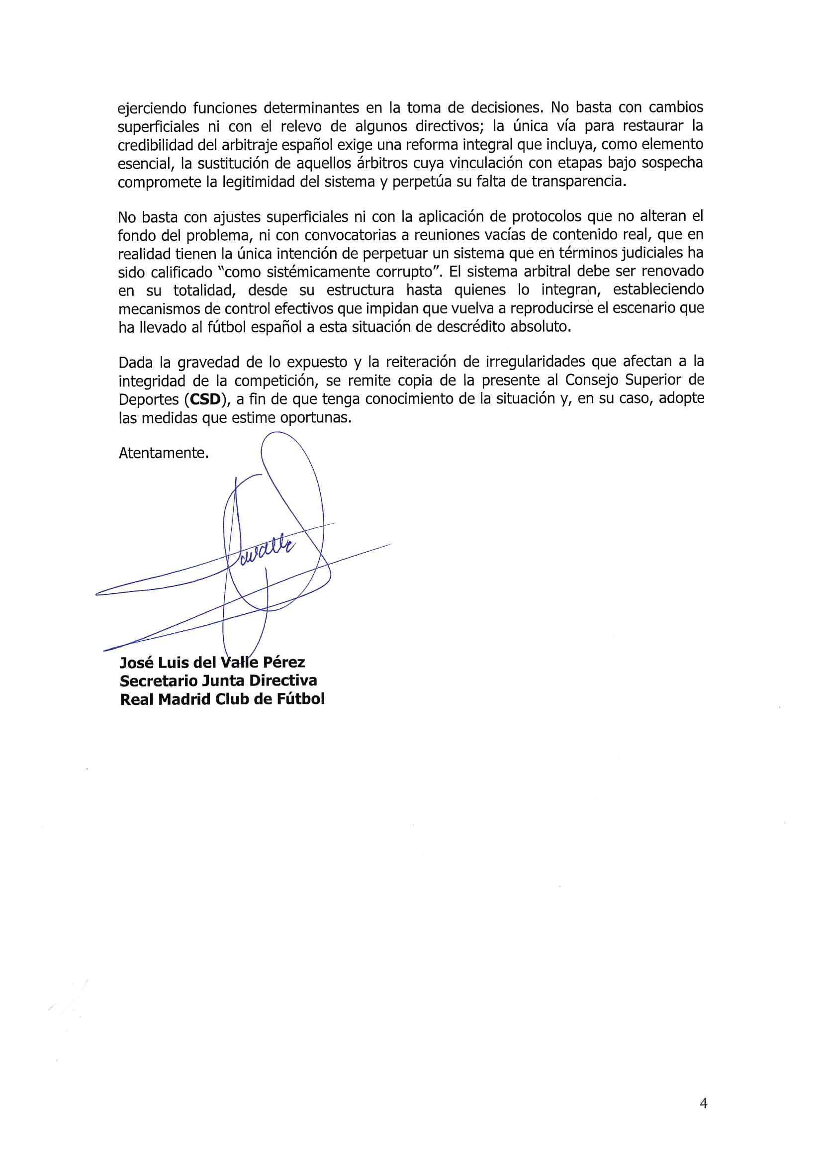 當地時間2月3日,皇馬正式就近期的爭議判罰正式向西班牙皇家足球聯合會提出對裁判系統(tǒng)和VAR操作的系統(tǒng)性不公指控,并抄送西班牙高級體育理事會,皇馬俱樂部董事會秘書José Luis del Valle Pérez簽署了投訴函。