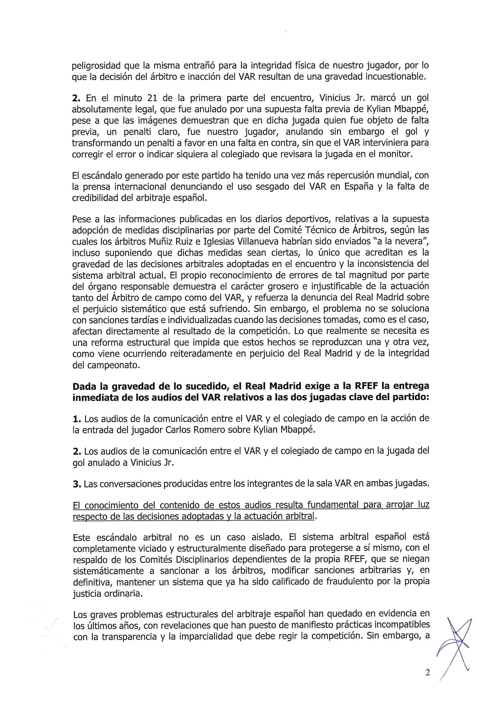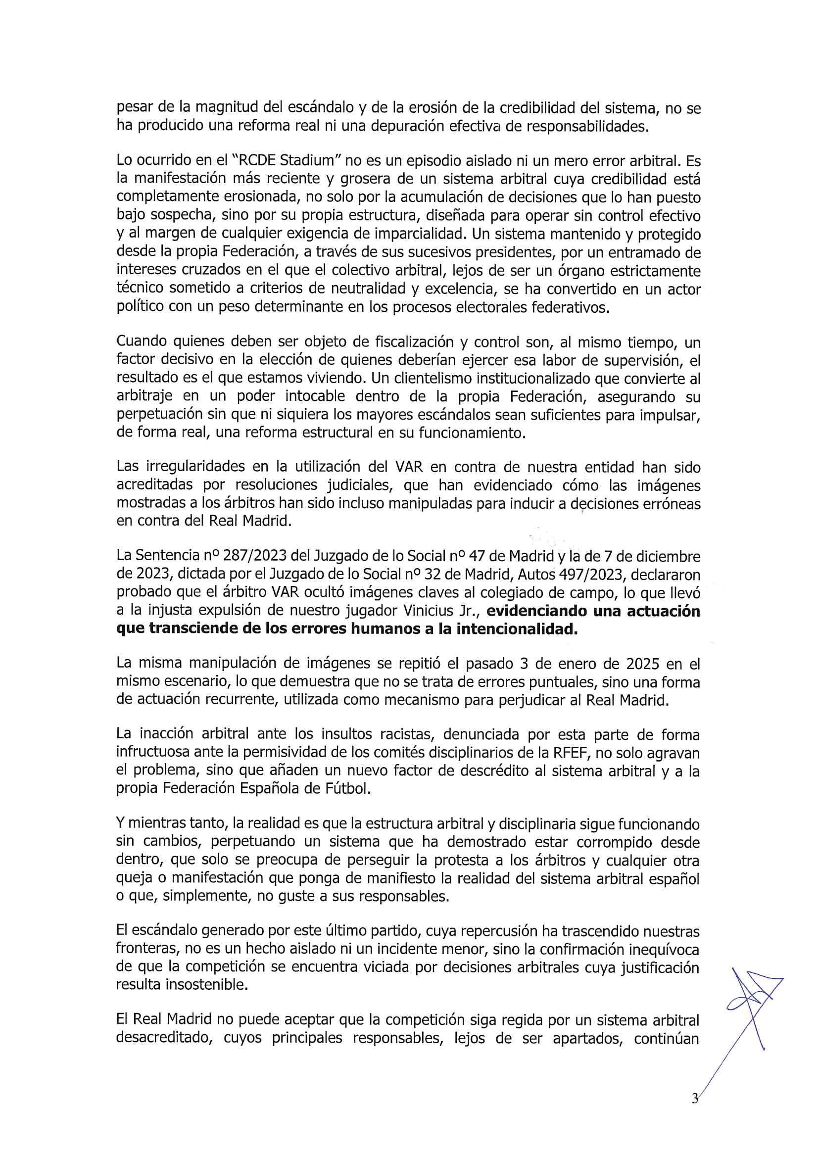 針對我們使用VAR(視頻助理裁判)的違規(guī)行為已經通過司法決議得到證實,這些決議揭示了向裁判員展示的圖像甚至被操縱以誘導他們做出錯誤的決定來反對皇家馬德里。