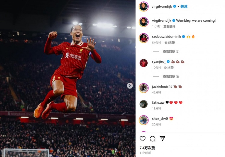 范迪克在賽后通過(guò)社媒曬出自己的慶祝照,并配文:“溫布利,我們來(lái)了!”