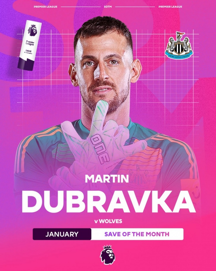 2月7日訊 英超官方公布了1月最佳撲救,獲獎(jiǎng)的是紐卡門將杜布拉夫卡。