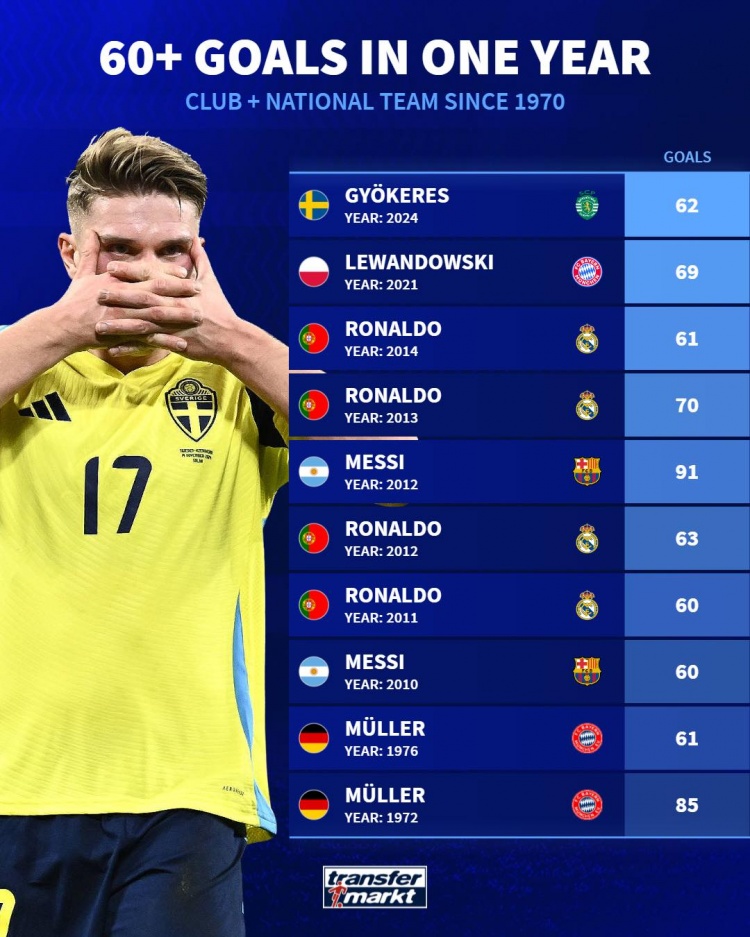 1月5日訊 德國(guó)轉(zhuǎn)會(huì)市場(chǎng)統(tǒng)計(jì)了1970年以來(lái)球員自然年的進(jìn)球數(shù)量,并列出自然年進(jìn)球60+球員,其中C羅4次做到,梅西2次,約克雷斯2024年打進(jìn)62球上榜。