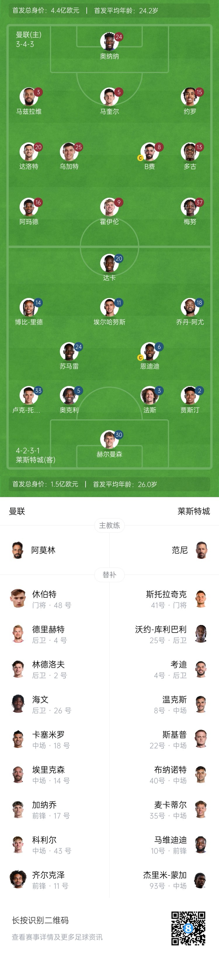 曼聯(lián)首發(fā):24-奧納納、3-馬茲拉維、5-馬奎爾、15-約羅、20-達(dá)洛特、25-烏加特、37-梅努、13-多古、8-B費(fèi)、16-阿瑪?shù)?迪亞洛、9-霍伊倫
