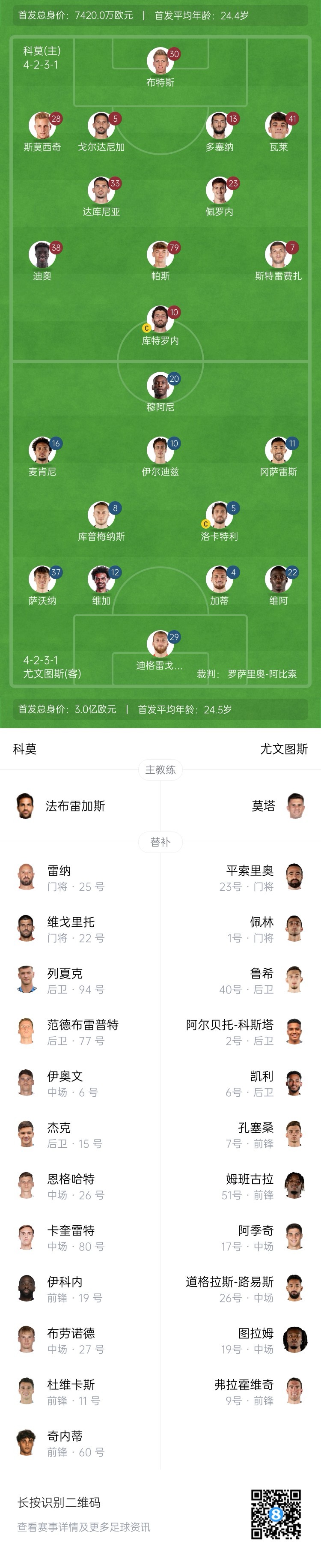 科莫替補:25-雷納、22-維戈里托、94-斯文-列夏克、77-范德布雷普特、6-伊奧文、15-費利佩-杰克、26-恩格哈特、80-卡奎雷特、19-伊科內(nèi)、27-布勞諾德、11-杜維卡斯、60-費德里科-基內(nèi)蒂