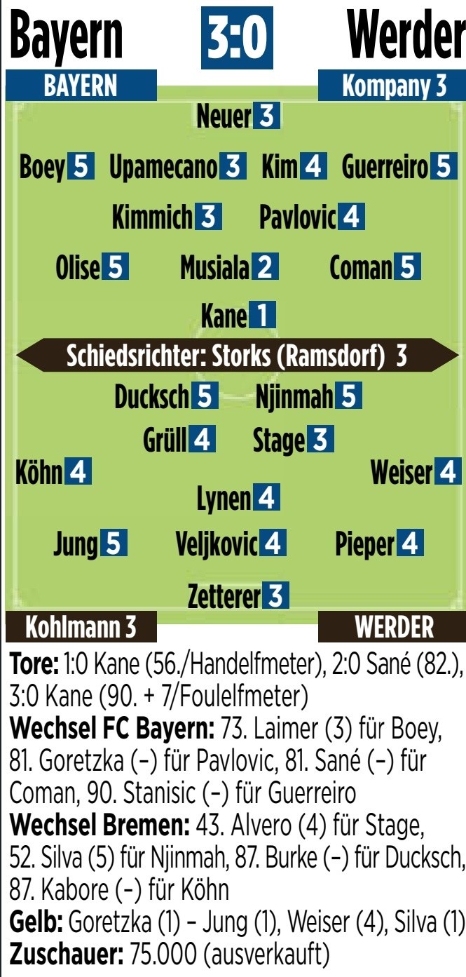 2月8日訊 德甲第21輪比賽,拜仁主場(chǎng)3-0擊敗不萊梅,德國(guó)媒體《圖片報(bào)》對(duì)兩隊(duì)球員進(jìn)行了評(píng)分,凱恩1分全場(chǎng)最高,穆西亞拉2分。