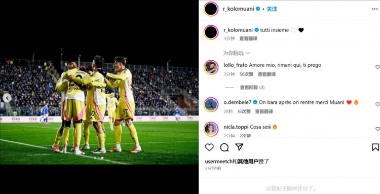 2月8日訊 在尤文2-1絕殺科莫后,梅開二度的穆阿尼在社交媒體上慶祝了勝利。