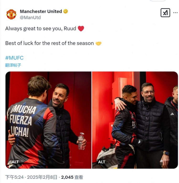 曼聯(lián)官方社媒曬出范尼的照片,配文:“很高興見(jiàn)到你,魯?shù)?。祝你本賽季剩余的比賽好運(yùn)。”