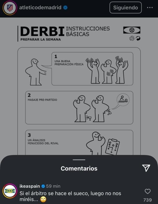 馬競在社交媒體上發(fā)布了一份模仿宜家家具安裝說明書的"德比賽前準備基本說明",其中包含四個步驟:體能準備、賽前按摩、分析對手,以及諷刺皇馬“使用官方電視臺對裁判施壓”。