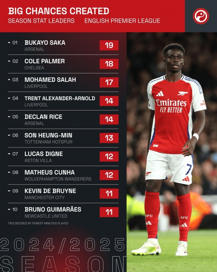 2月8日訊 squawka統(tǒng)計(jì)了本賽季英超創(chuàng)造重大機(jī)會(huì)情況,薩卡力壓帕爾默居首。