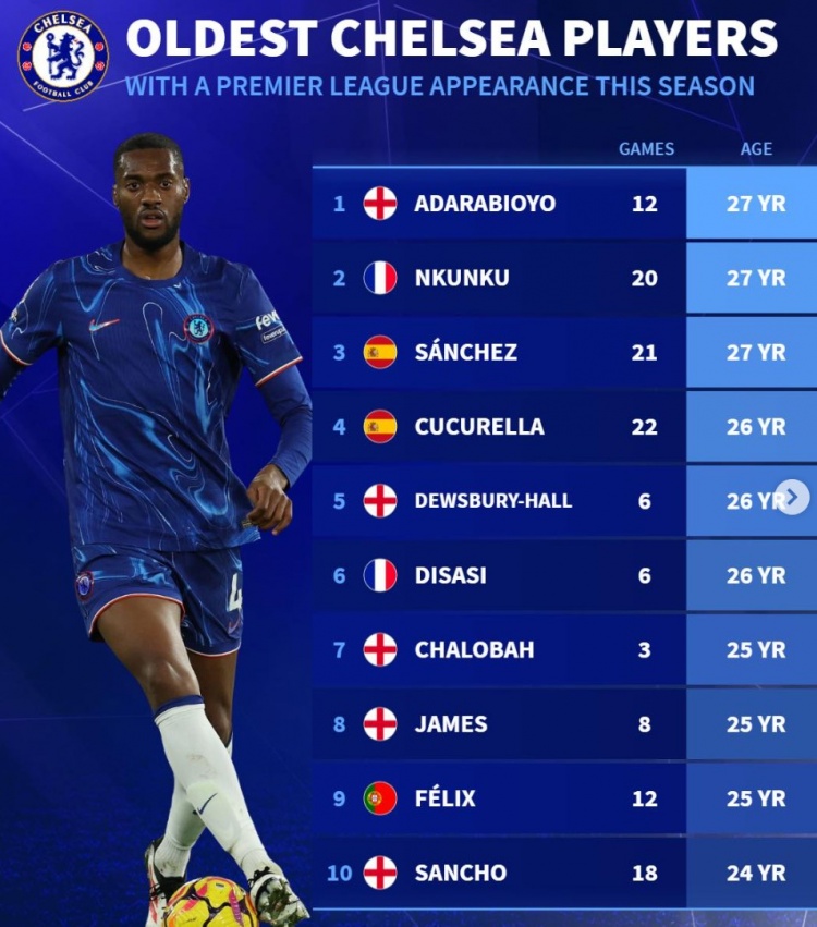 除特別注明外,本站所有內(nèi)容均為九球直播整理排版,轉(zhuǎn)載請注明出處:切爾西本賽季英超出場年齡最大球員僅27歲,24歲桑喬已是第10老