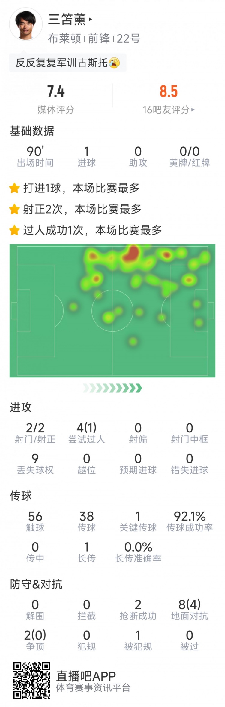 除特別注明外,本站所有內(nèi)容均為九球直播整理排版,轉(zhuǎn)載請注明出處:三笘薫本場數(shù)據(jù):1粒進球,2次射門均射正,1次關(guān)鍵傳球