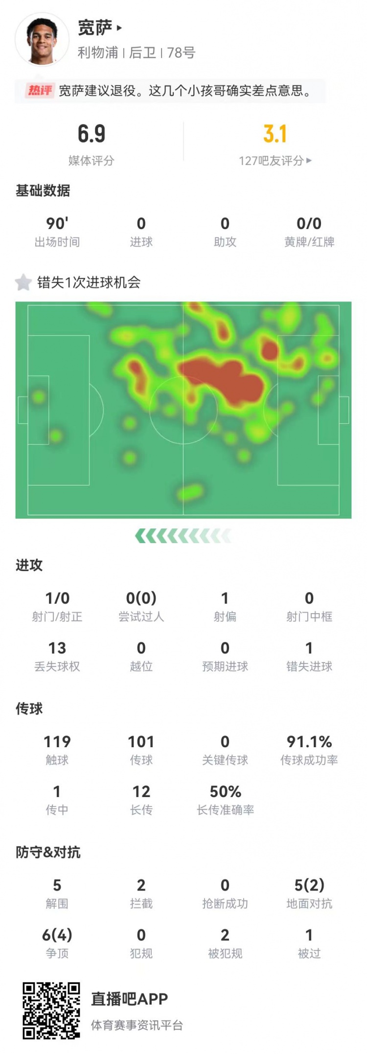 除特別注明外,本站所有內(nèi)容均為九球直播整理排版,轉(zhuǎn)載請注明出處:寬薩本場1失良機(jī)+5解圍2攔截 11對抗6成功+2造犯規(guī) 獲評6.9分