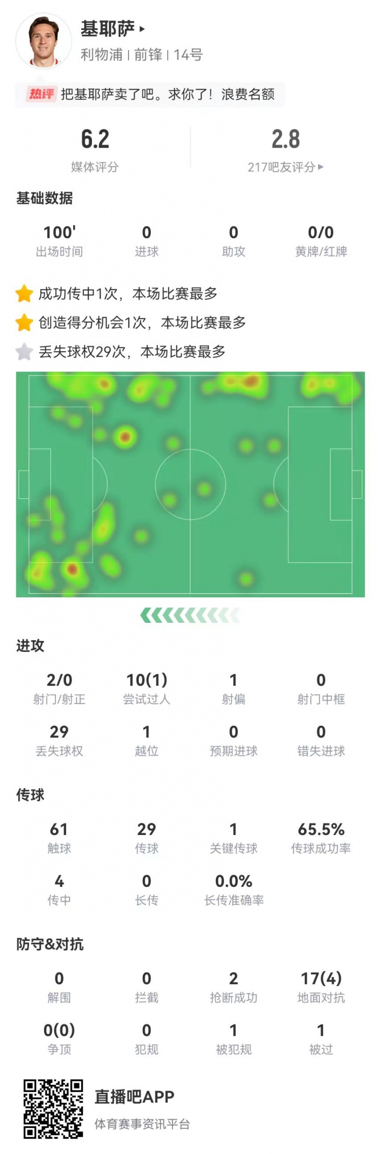 2月10日訊 利物浦在本輪足總杯爆冷0-1不敵普利茅斯,基耶薩本場數(shù)據(jù)如下: