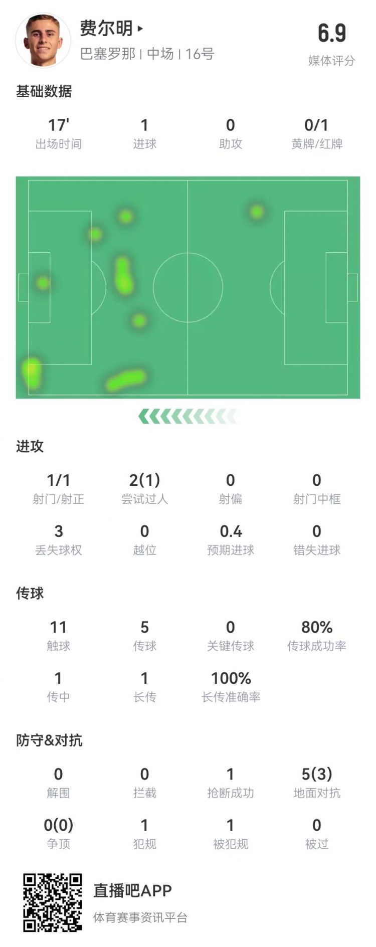 2月10日訊 巴薩在本輪西甲3-1領(lǐng)先塞維利亞,費(fèi)爾明本場(chǎng)數(shù)據(jù)如下: