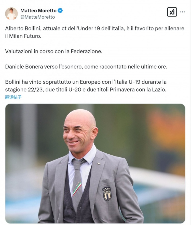 根據(jù)媒體的報道,米蘭未來隊主帥博內(nèi)拉即將被解雇。莫雷托指出,意大利U19青年隊現(xiàn)任主帥博里尼是接手米蘭未來隊的熱門人選,他正與意大利足協(xié)評估未來。