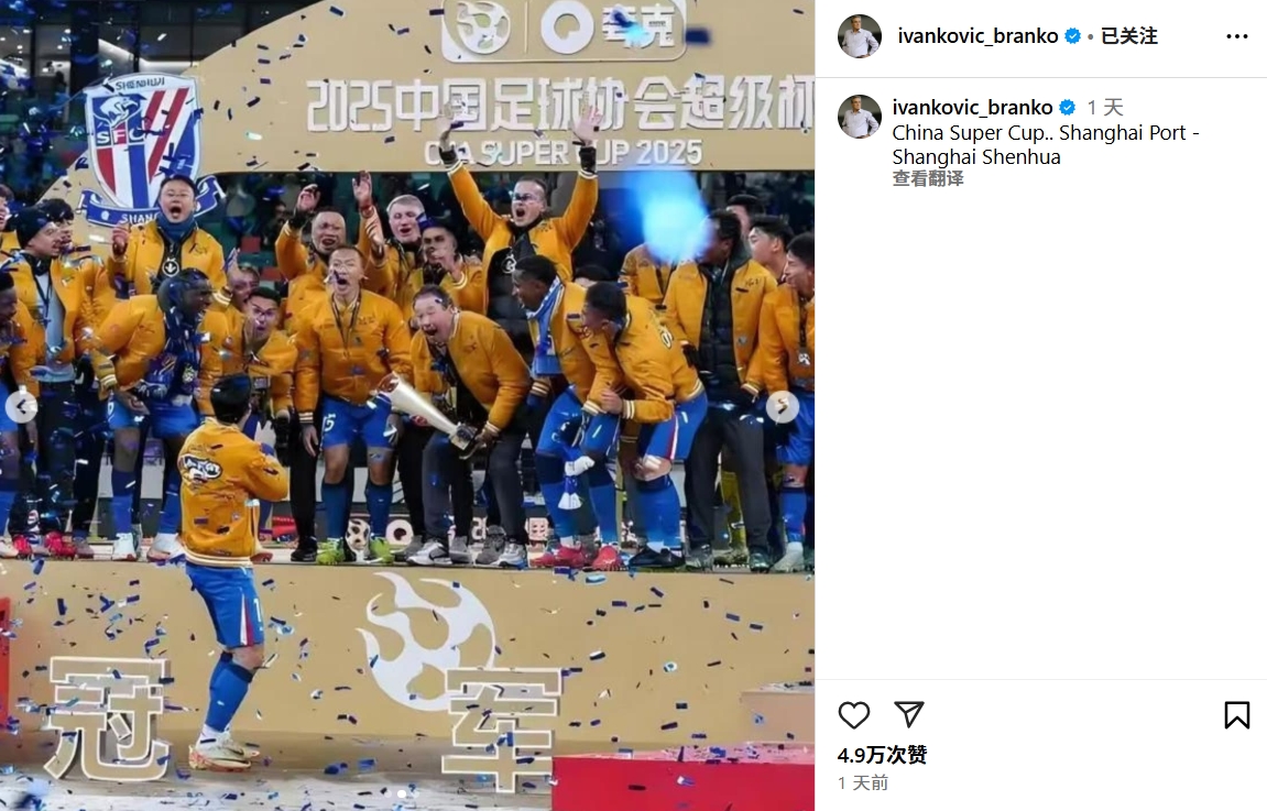2月10日訊 上周末進行的中國足協(xié)超級杯,上海申花3-2絕殺上海海港獲得冠軍。本場比賽中國男足主帥伊萬科維奇來到了現(xiàn)場,關注球員的表現(xiàn),并在社交媒體曬出了現(xiàn)場照片。