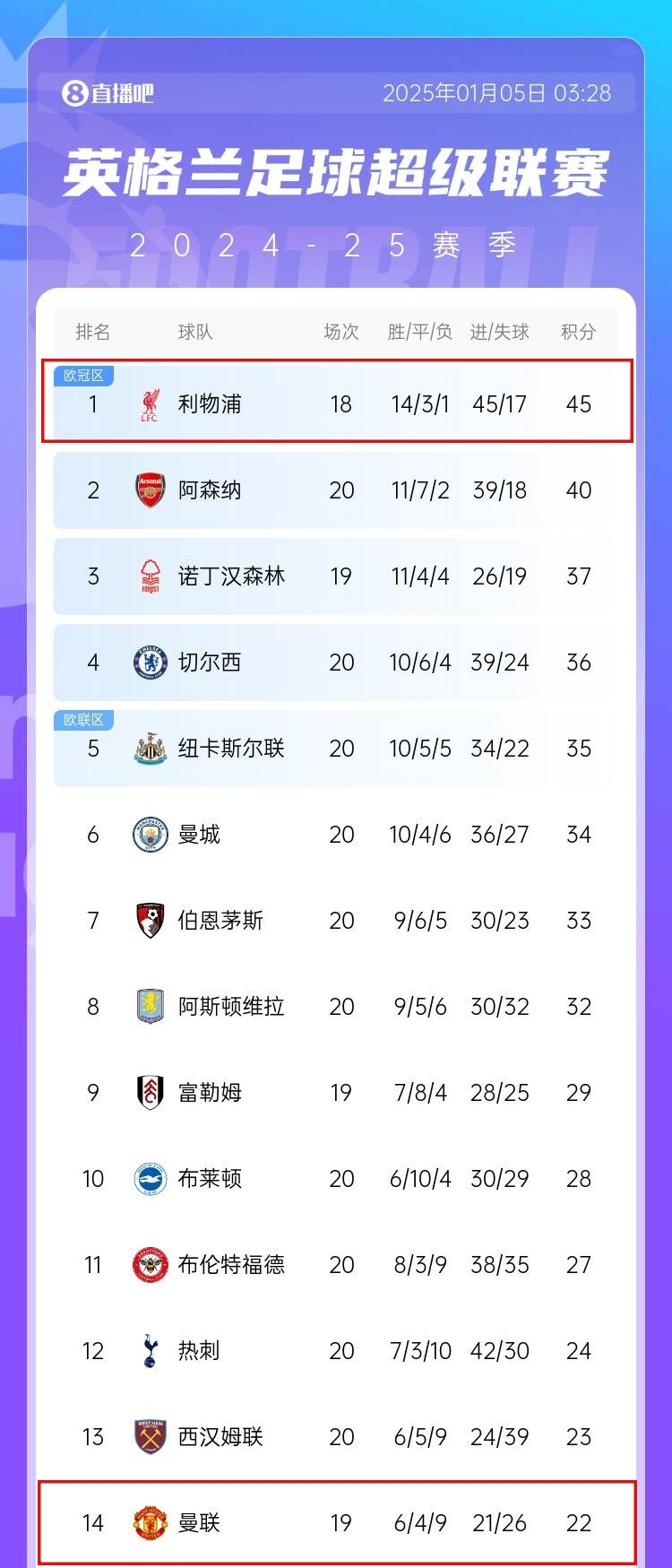 利物浦目前高居英超榜首,少賽兩場領(lǐng)先第二的阿森納5分,各項賽事已23場不??;曼聯(lián)則排名英超第14,高出降級區(qū)7分,各項賽事4連敗。