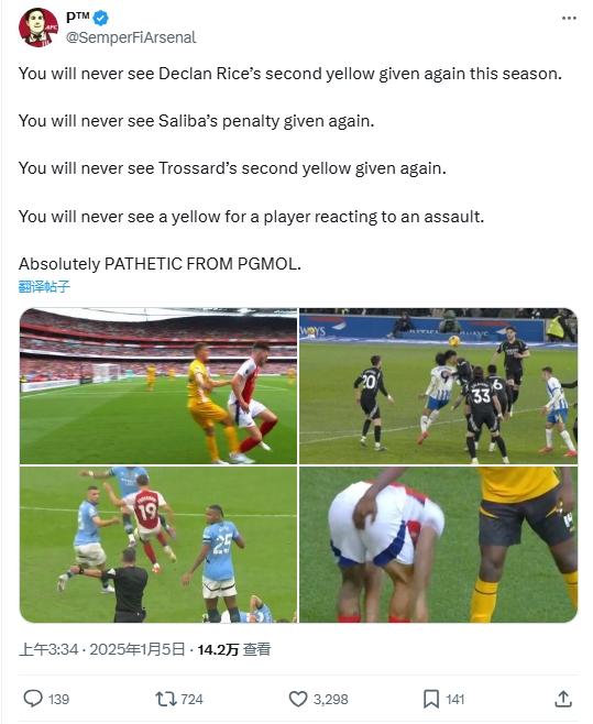 賽后有槍迷在社媒曬出阿森納本賽季在英超遭遇的多次爭(zhēng)議判罰,寫(xiě)道: