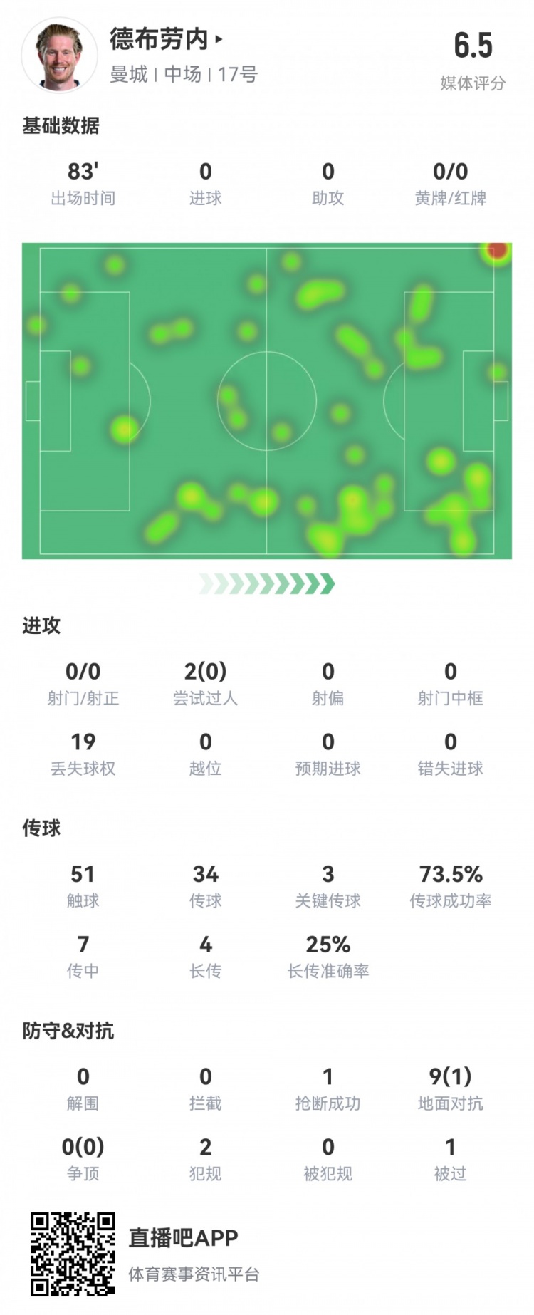 除特別注明外,本站所有內(nèi)容均為九球直播整理排版,轉(zhuǎn)載請(qǐng)注明出處:德布勞內(nèi)數(shù)據(jù):0射0正,3次關(guān)鍵傳球,19次丟失球權(quán),評(píng)分僅6.5