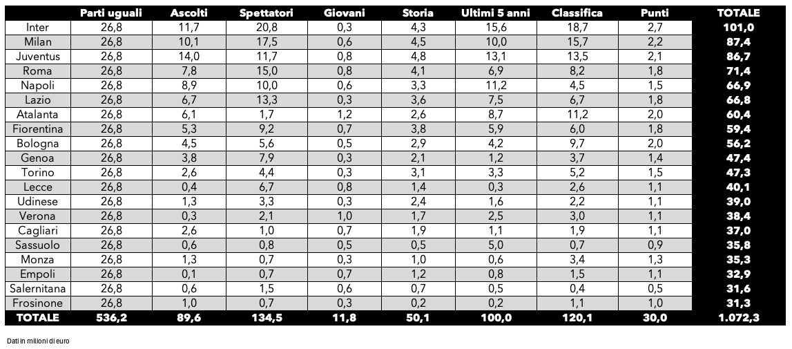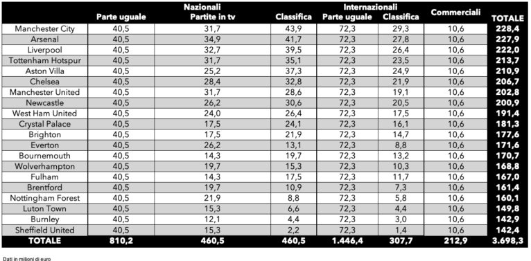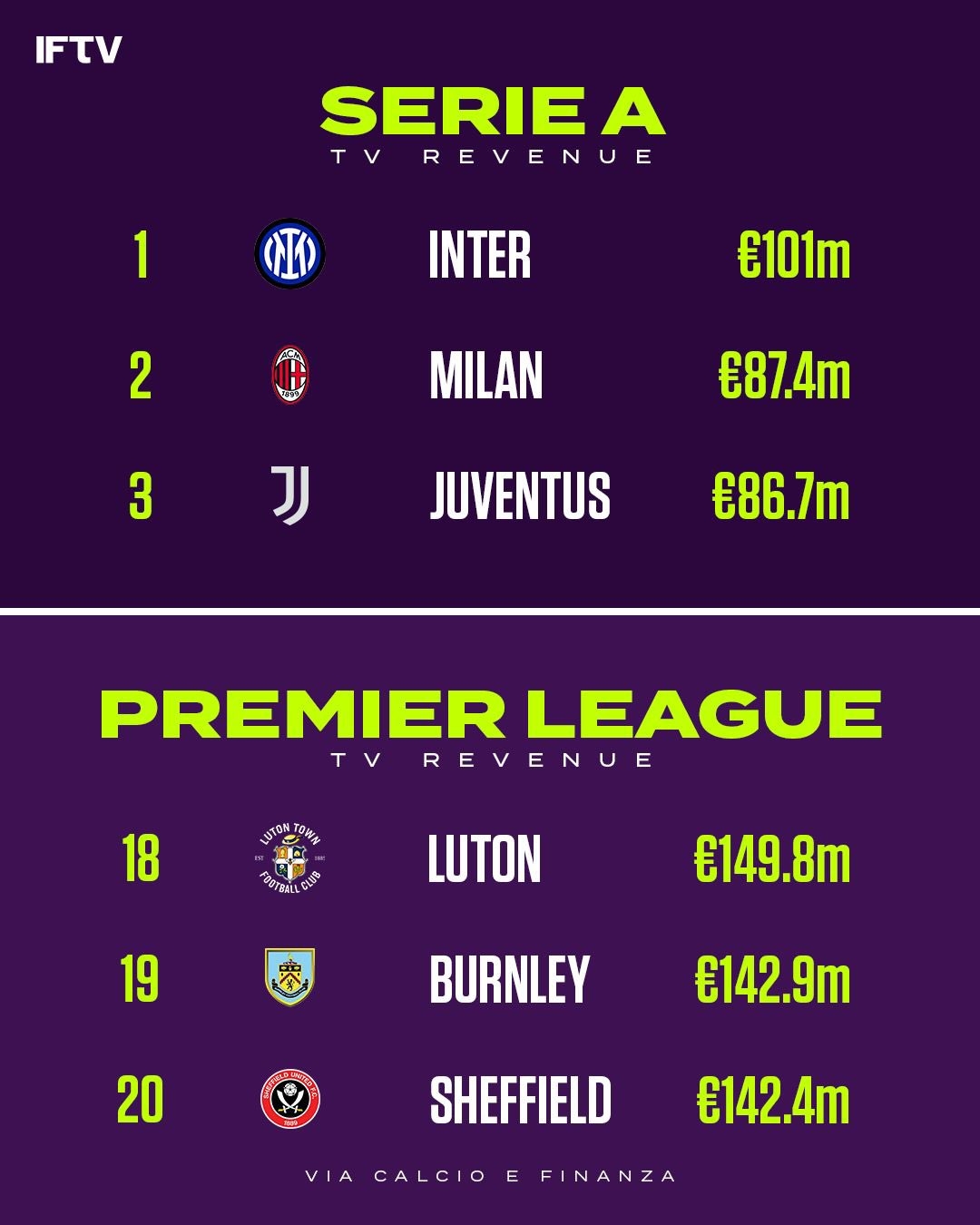 其中意甲前三收入的國米(1.01億歐)、米蘭(8740萬歐)、尤文(8670萬歐)。而英超上賽季降級的三支隊的轉(zhuǎn)播權(quán)收入都遠超意甲前三,盧頓(1.498億歐)、伯恩利(1.429億歐)、謝菲爾德聯(lián)(1.424億歐)。