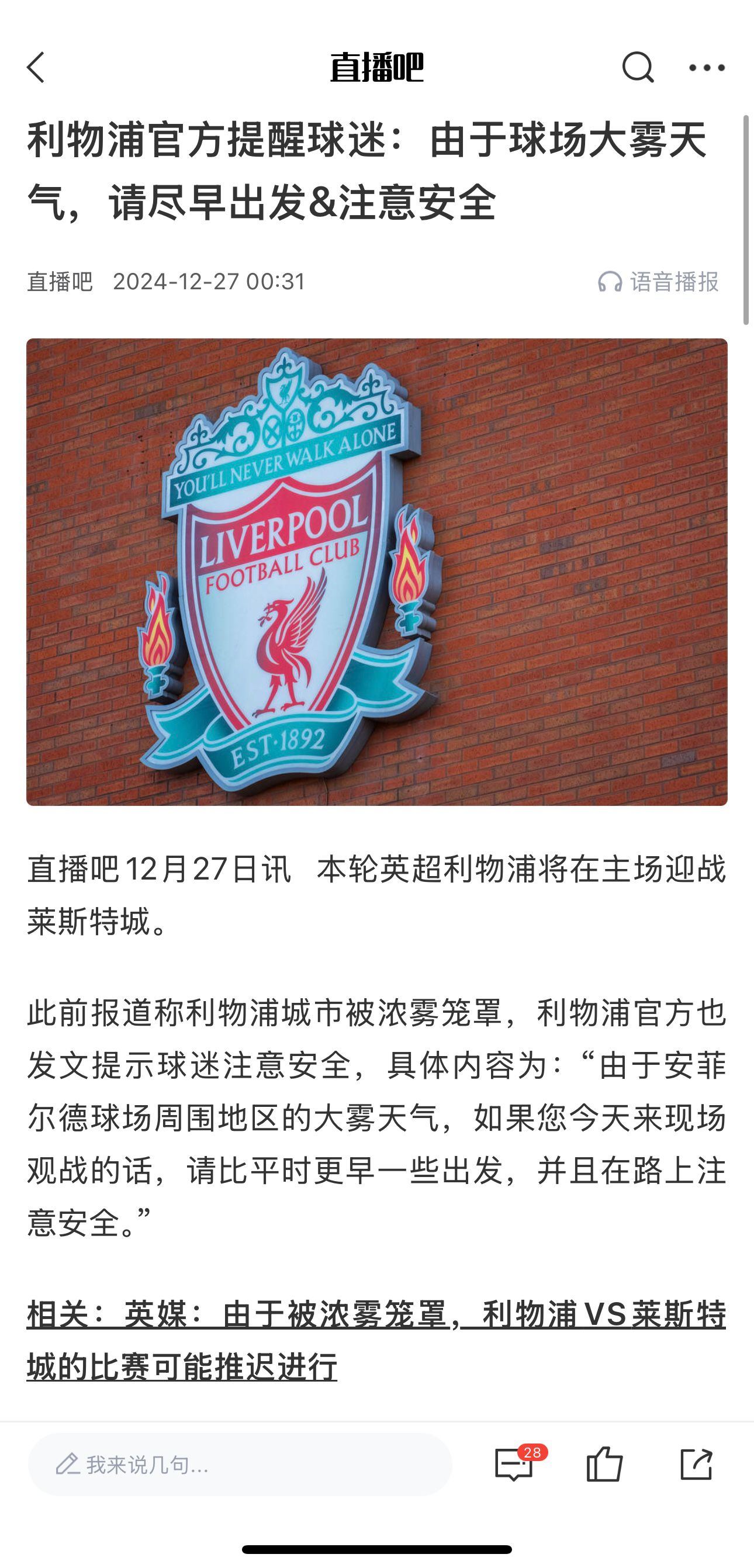 發(fā)布時間:2025年01月05日 15:50點擊:欄目:足球新聞 01月05日訊 1月6日00:30,英超第20輪,利物浦將在安菲爾德球場對陣曼聯(lián)。但因利物浦地區(qū)持續(xù)降雪,雙紅會可能受到影響。利物浦本賽季已經(jīng)多次在比賽日遭遇惡劣天氣。英超第14輪的默西塞德郡德比,利物浦客戰(zhàn)埃弗頓因狂風天氣延期,至今未完成補賽。英超第18輪利物浦主場對陣萊斯特城,安菲爾德球場被濃霧籠罩,雙方在大霧中完成了比賽,利物浦3-1取勝。 除特別注明外,本站所有內容均為九球直播整理排版,轉載請注明出處:老天上強度?利物浦比賽日遭遇的惡劣天氣:狂風、濃霧、大雪…… 本文標簽: 足球 英超 利物浦 話題
