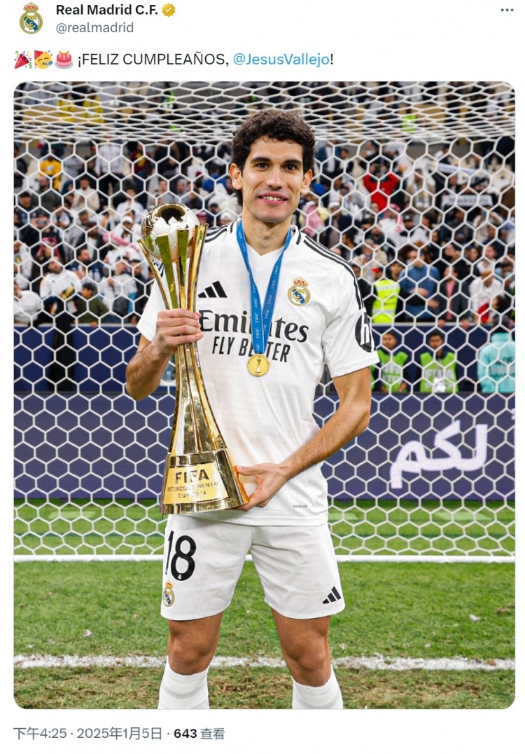 皇馬官方社媒曬出巴列霍與洲際杯獎杯的合照,配文:“生日快樂,巴列霍!”