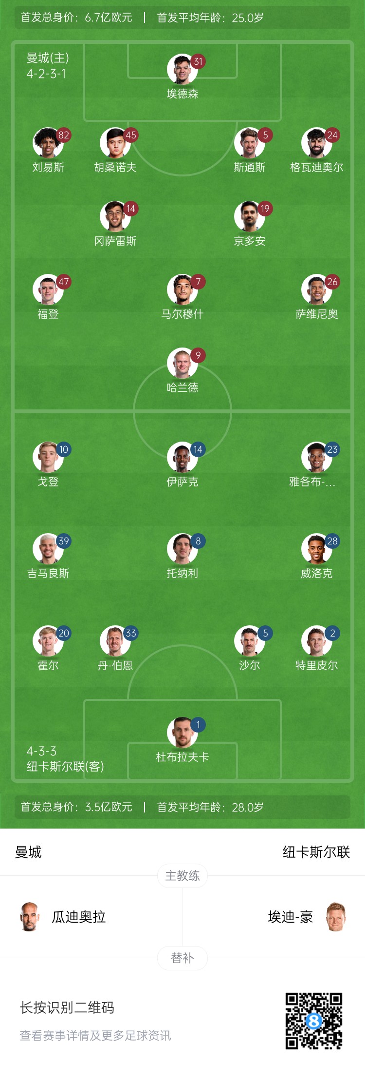 曼城首發(fā):31-埃德森、82-劉易斯、45-胡桑諾夫、5-斯通斯、24-格瓦迪奧爾、14-尼科-岡薩雷斯、19-京多安、47-福登、7-馬爾穆什、26-薩維尼奧、9-哈蘭德
