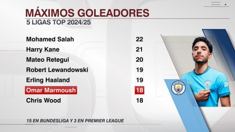 據(jù)ESPN統(tǒng)計(jì),馬爾穆什本賽季在聯(lián)賽中打進(jìn)18球,并列排名本賽季五大聯(lián)賽射手榜第6位。