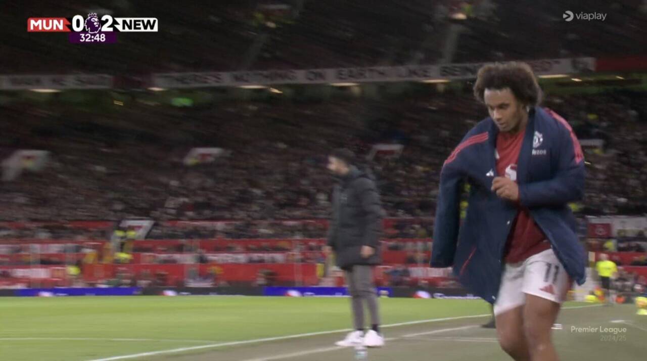 比賽上半場(chǎng),曼聯(lián)連丟2球0-2落后紐卡,主帥阿莫林將齊爾克澤提前換下,梅努替補(bǔ)登場(chǎng)。