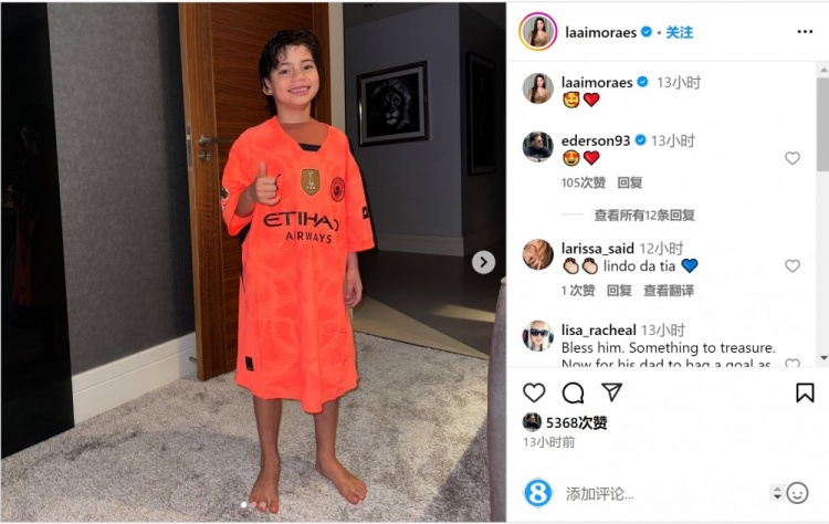 埃德森賽后將球衣送給了自己的兒子,埃德森的妻子萊斯更新社媒動態(tài),曬出兒子身穿球衣的照片。