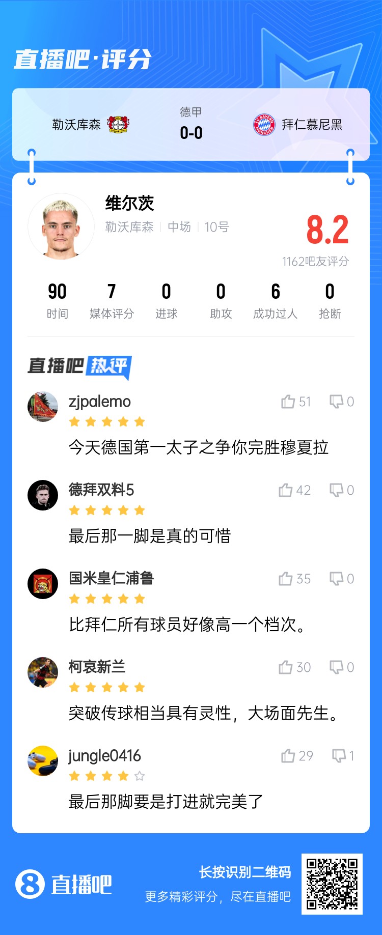 維爾茨在凌晨的比賽中6次成功過人,給拜仁的后防線帶來了很大壓力,但也在比賽最后時(shí)刻錯(cuò)失了絕殺良機(jī)。