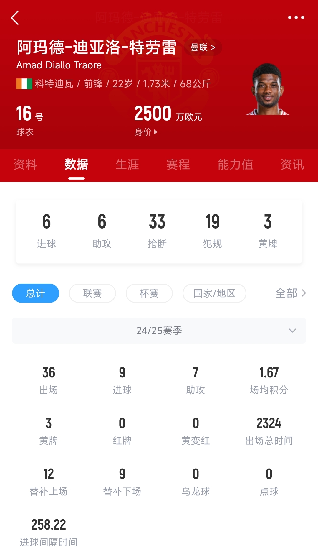 22歲的科特迪瓦前鋒阿瑪?shù)?,本賽季代表曼?lián)各賽事出戰(zhàn)36場比賽,貢獻9粒進球和7次助攻,與B費并列為曼聯(lián)隊內的頭號射手。
